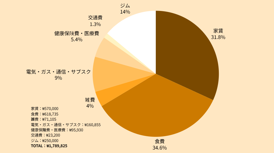 - 家賃(管理費, Wi-Fi, 水道料金込み):₩570,000